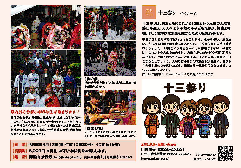 | 十三才と言う年齢は、男女ともに心も体も、おとなと子供の境目にあり、 おとなになるための特別の年齢と言えます。 そうした大切な時期に、 おとなとして生きてゆくための知恵を授かるようにお参りするのが、 「十三参り」です。 ちょうど十二支(えと)がひと回りしたお祝いと、 厄除(やくよ)けの祈りがこめられています。 |